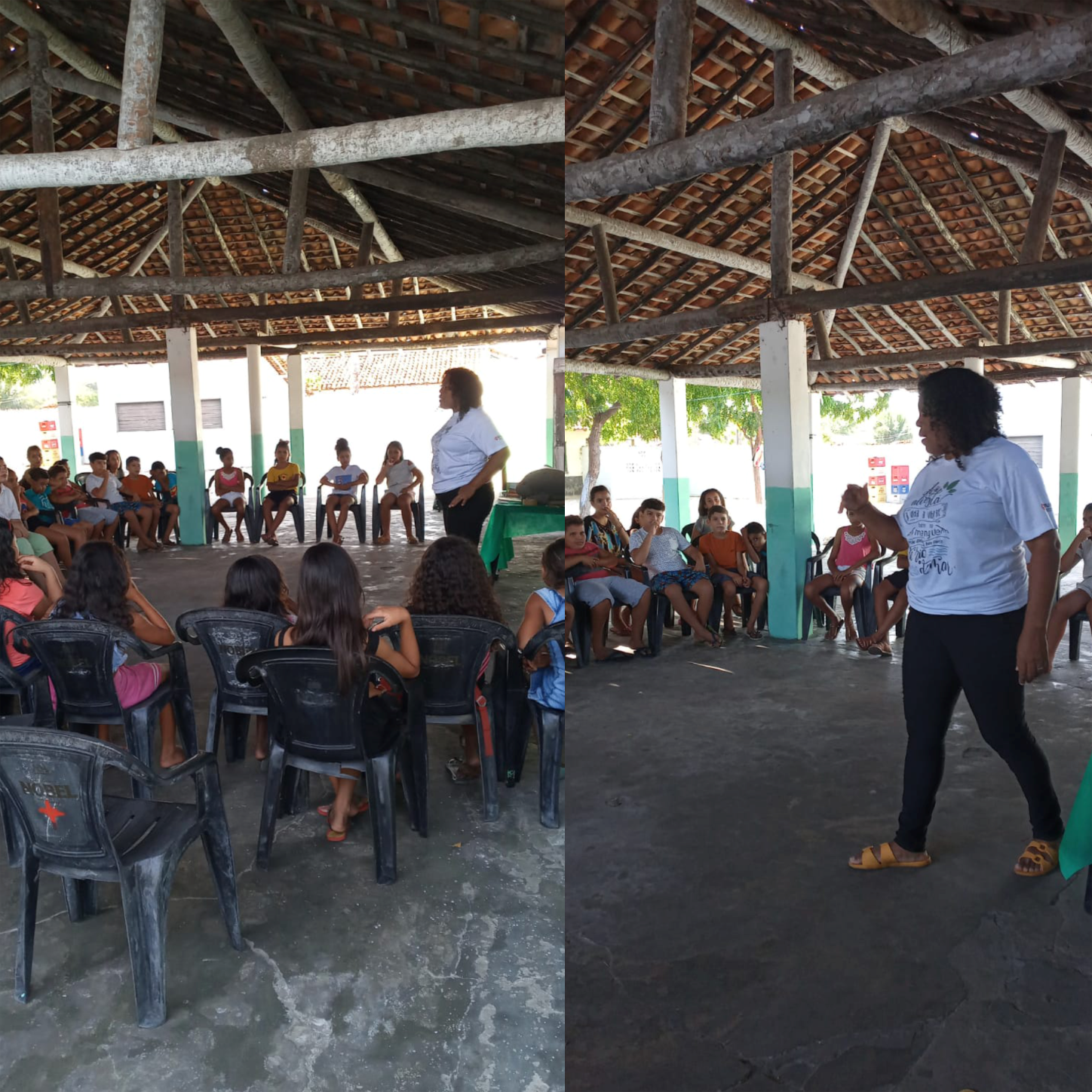 Após a explanação do painel, as crianças foram divididas em grupos e, através de um Diagnóstico Rápido e Participativo, elas representassem desenhos destacando o que tem dentro da RESEX seguindo esses tópicos: FAUNA, FLORA, ATIVIDADES ECONÔMICAS E CULTURA. Cerca de 40 crianças puderam se divertir e aprender com as atividades de Educação Ambiental. As dinâmicas foram aplicadas pela Coordenadora e Educadora Ambiental do Projeto, Rosângela Maria.